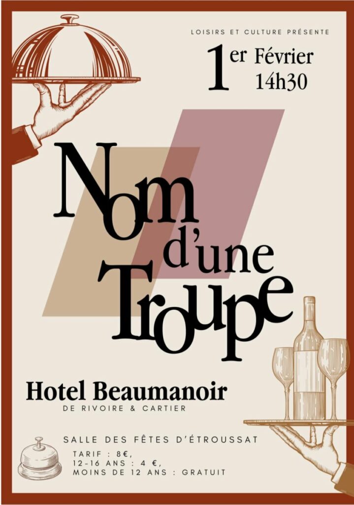 Un huis clos d’hôtel où tout s’emmêle (mensonges, quiproquos, panique) : parfait pour une troupe qui veut du jeu et du public.