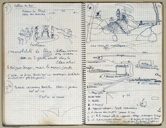 Ce qui permet de constituer ces archives du spectacle est avant tout un état d’esprit qu’on peut qualifier d’esprit « historien. » Il s’agit de se demander ce qui pourra servir plus tard à restituer le processus de création mais aussi l’événement. Un des outils privilégiés de cette mémoire de la création, parce que c’est aussi un outil de la production, est le cahier de mise en scène ou « cahier de régie ». Produits par les metteur·e·s en scène, assitant·e·s ou régisseu·r·euse·s, ils existent depuis qu’il est besoin de fixer le spectacle sur un document pour d’éventuelles reprises. Le texte de la pièce y est reproduit, et équipé d’indications scéniques, déplacements, jeux, photos, schémas. Il peut se rapprocher d’un storyboard. Lorsqu’il s’agit d’une mise en scène professionnelle, elle est légalement déclarée comme une œuvre et donne lieu à la perception de droits. On conçoit donc dans ce cas en particulier que ce type de cahier soit le plus détaillé possible. Il s’agit souvent de saisir l’attitude ou la psychologie du personnage alors qu’il dit telle ou telle réplique. Le commentaire peut préciser les motivations du personnage, l’implicite, les pauses ou le rythme auquel est émis le texte en scène.