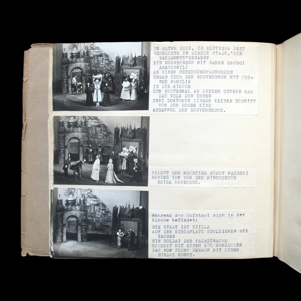 Pourtant, s’il est une réussite à signaler en la matière, c’est celle du Modellbuch brechtien, composé pour chaque mise en scène, d’une étude du texte, de remarques sur les répétitions et de 1500 clichés photographiques. Bertolt Brecht fut un des auteurs de théâtre le plus importants du XXe siècle. Son approche du théâtre comme outil de critique et de transformation de la société demeure extrêmement riche, tant par les pièces qu’il a laissées que par son œuvre théorique. Pour chacune de ses pièces, qu’il mettait lui-même en scène avec sa troupe du Berliner Ensemble, il entreprit de réaliser un Modellbuch, un « livre-modèle » présentant le spectacle. Cette démarche est indissociable de la démarche « révolutionnaire » de Brecht, qui entendait réformer le théâtre et pour qui le Modellbuch était un moyen de diffuser sa vision théâtrale nouvelle. Cependant, l’objectif du Modellbuch reste aussi à questionner car pour Brecht, il s’agit bien de fournir un modèle, autrement dit une représentation que des mises en scènes ultérieures pourront imiter. Il ne saurait en être de même pour le cahier de régie ou de mise en scène : c’est un document utile pour la mémoire du spectacle, mais qui n’a aucune vocation à devenir une « mise en scène modèle » à appliquer par toutes les compagnies mettant en scène l’œuvre par la suite. Ces dernières conservent en effet toute leur liberté de création.