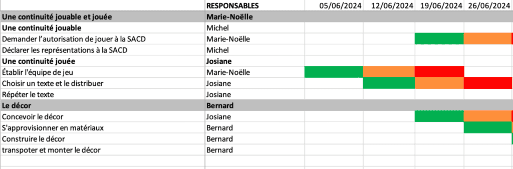 La gestion de l’échéancier de la saison : à partir de l’ODT, on met en séquence chaque activité, en lui attribuant un responsable, un délai de réalisation au plus tôt, normal et au plus tard. C’est qu’en jargon de projet, on appelle un diagramme de gantt, du nom de son inventeur.
