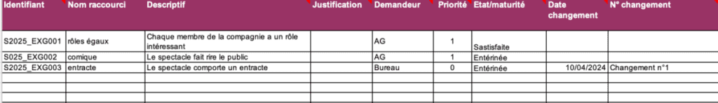Processus de la validation des exigences : on définit les exigences de la saison (par exemple : chaque membre de la compagnie joue et ait un rôle intéressant, le spectacle fait rire le public, le spectacle comporte un entracte, etc.), la manière dont elles peuvent être modifiées et vérifiées.