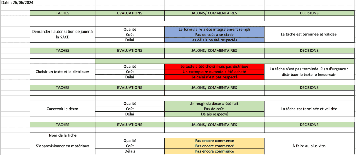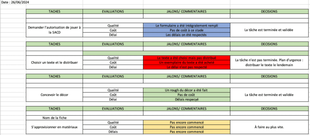 Les phases To Check, vérifier et To Act, agir, viendront lors des réunions d’étape de la saison. Pendant ces réunions d’étape, on complète le tableau de bord de la saison. Chaque jalon est alors évalué. Trois possibilités s’offrent au responsable de la saison : le jalon est validé, le jalon est terminé, le jalon est refusé. Avec cette dernière possibilité, une action correctrice est mise en place. Cette dernière peut jouer sur les trois pilliers de tout projet : on décale de délai pour parvenir à la bonne réalisation du jalon, on ajuste le budget en programmant une dépense supplémentaire, on change la qualité. Exemple : le vase de la petite commode de votre décor doit être peint en rose pour le 19 janvier. Or, lors de la réunion d’étape du 20 janvier, la cheffe de projet note que le vase n’est toujours pas peint. Le jalon correspondant est donc refusé et voici comment est gérée la chose : on ne peut pas jouer sur le délai car la première est le 21 janvier. Prévoir une dépense supplémentaire serait inutile, on ne jouera donc pas sur les coûts. En revanche, on jouera sur la qualité : le vase sera retiré du décor, car sans peinture, il ne s’accorderait pas avec le reste.