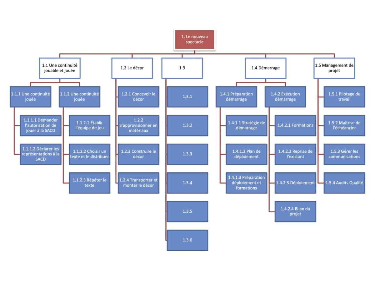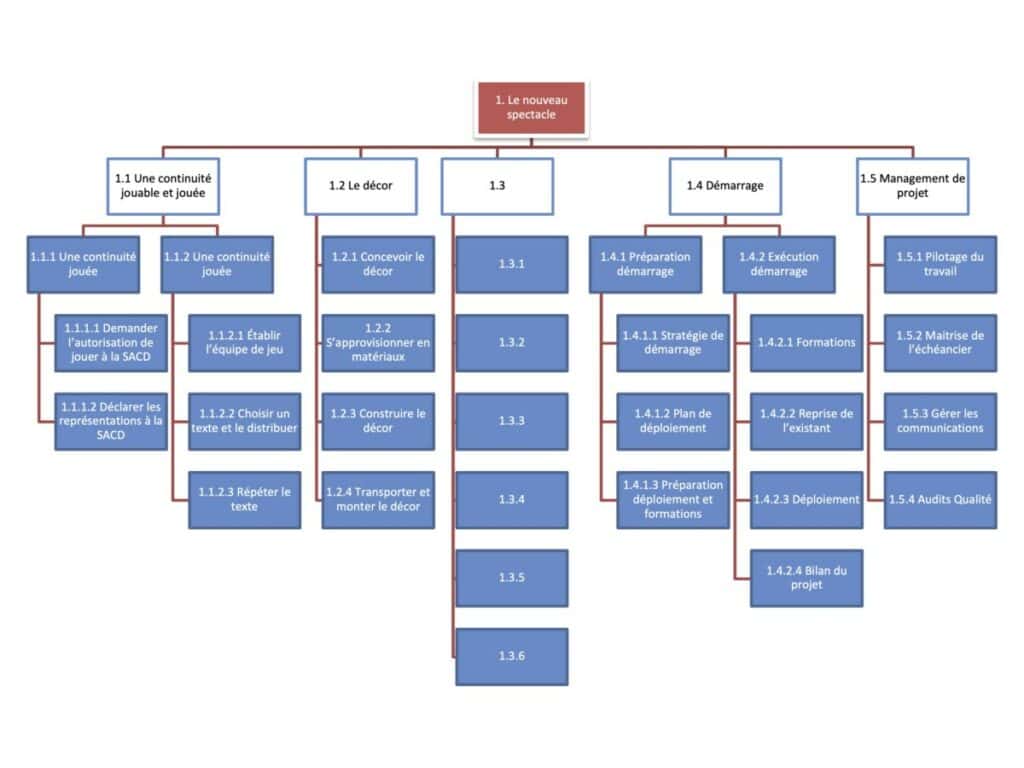 C’est à ce moment qu’est précisé le produit final, par exemple : un spectacle issu du répertoire de Boulevard avec un décor complexe, des intermèdes musicaux joués en direct et une trentaine d’effets lumière différents. On définit alors les livrables de la saison : continuité jouée, décor, costumes, accessoires, affiches, etc. En prenant appui sur ce document, on présente alors l’organigramme des tâches (ODT) de la saison, lequel montre les tâches nécessaires à l’élaboration de chaque livrable.