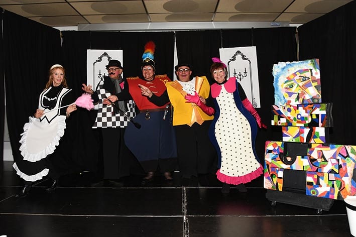 Un autre exemple de mise en scène appartient à la compagnie Y Sol en Scène. La production de la pièce par regroupait 5 interprètes, 3 femmes et 2 hommes. La troupe avait joué à plein le côté « Cluedo » de la pièce. Un ingénieux système de costumes permettait des changements rapides et donnait aux personnages des allures de cartes à jouer.